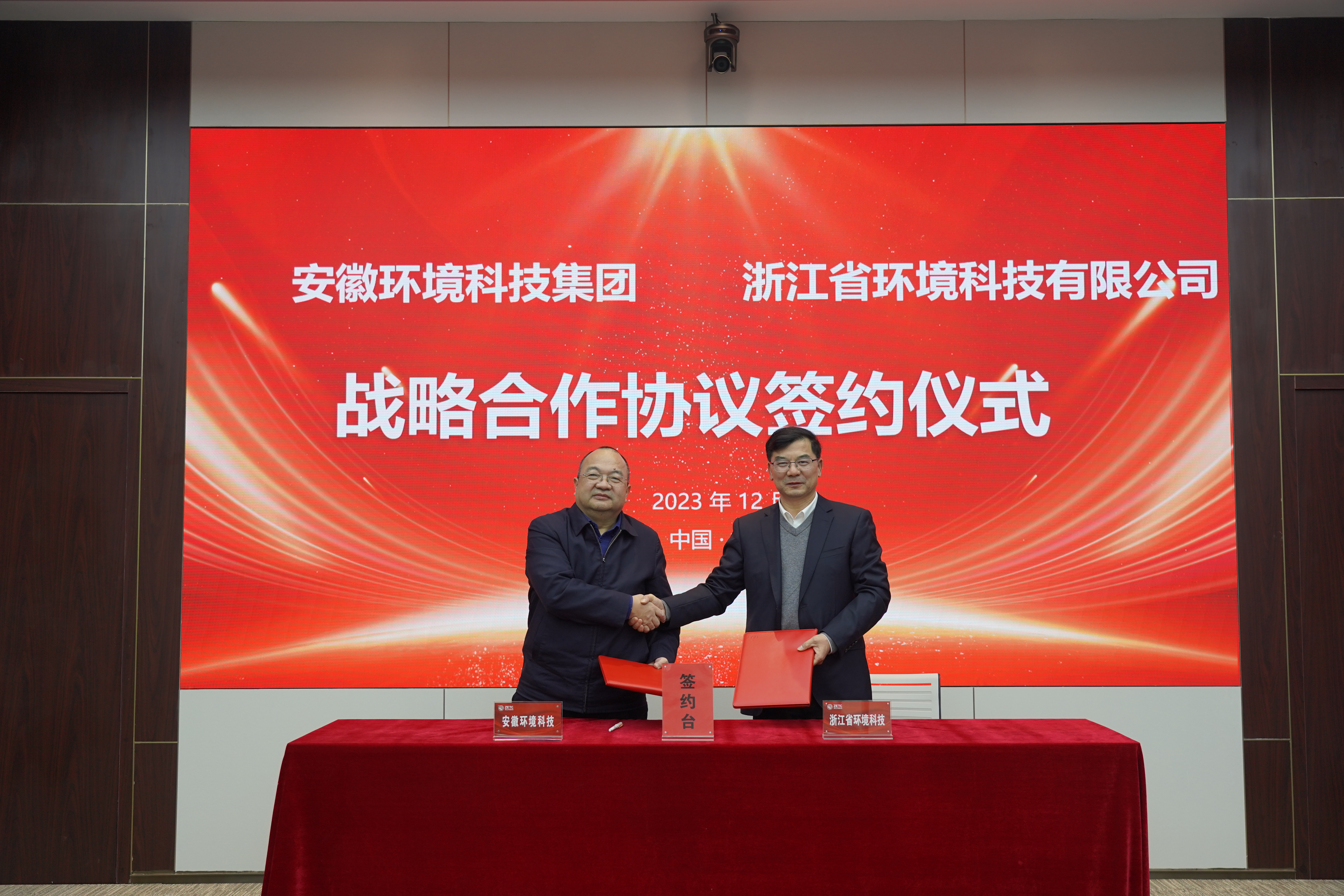 浙江省環(huán)境科技有限公司黨委書(shū)記、董事長(zhǎng)韋彥斐,安徽環(huán)境科技集團(tuán)黨委書(shū)記、董事長(zhǎng)方降龍代表雙方簽訂戰(zhàn)略合作協(xié)議。