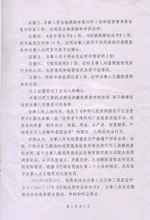 2015年7月6日,上述當事人經登記機關核準登記注冊蚌埠市七寶鹽業經營有限公司。8月中旬,當事人建立中文域名為“蚌埠市七寶鹽業經營有限公司”、網址為http://www.qibaoyanye.com的宣傳網站。當事人在其網站頁面使用“蚌埠市七寶鹽業經營有限公司為中國鹽業總公司蚌埠地區獨家代理商,全權代理中鹽全部產品,并擁有招收代理經銷資格”、“經銷商授權證書”、“中鹽”注冊商標標識等大量虛假宣傳廣告。