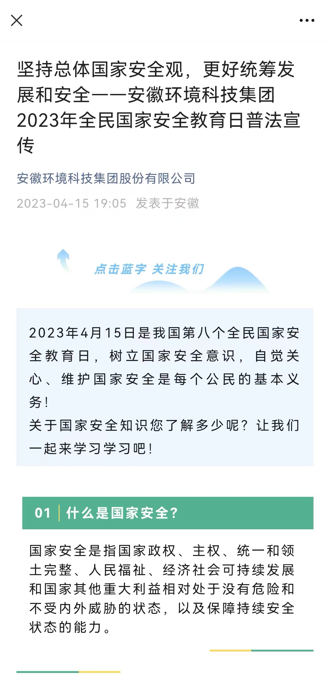 環(huán)境公司、發(fā)展公司、地產(chǎn)集團(tuán)在微信公眾號、官網(wǎng)政策法規(guī)平臺上傳國家安全相關(guān)法律法規(guī),在辦公場所張貼宣傳海報。