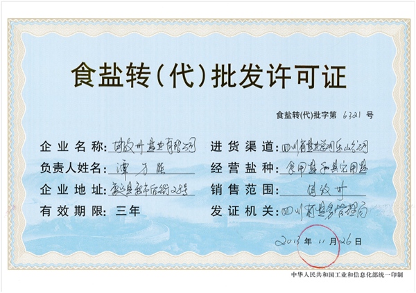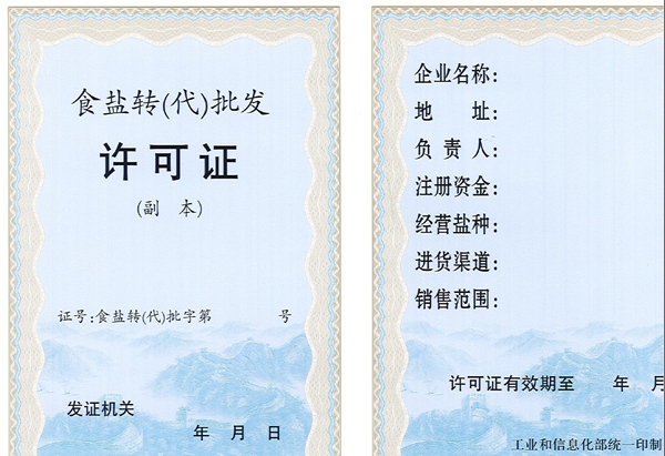 (五)分析情況:對一個持有食鹽批發許可證的食鹽定點生產企業/省級鹽業公司申請,為其訂立排他性代理合同的中間商領取食鹽轉(代)批發許可證。由于該證“進貨渠道”填制的是提出申請的持有食鹽批發許可證的食鹽定點生產企業/省級鹽業公司,因此不會形成食鹽批發許可證現有基數增加的情況。