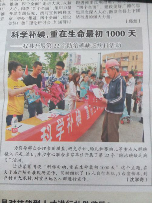《今日廣德報》:科學補碘,重在生命最初100天 ——我縣開展第22個防治碘缺乏病日活動
