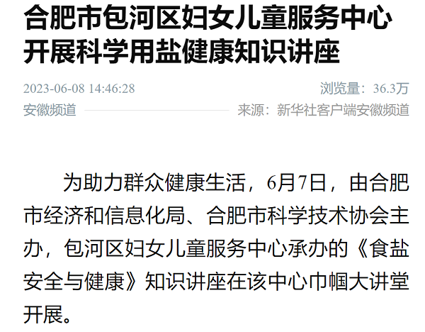 6月8日,新華社客戶端安徽頻道發表題為《合肥市包河區婦女兒童服務中心開展科學用鹽健康知識講座》的文章,截至發稿日瀏覽量達40.7萬人次。