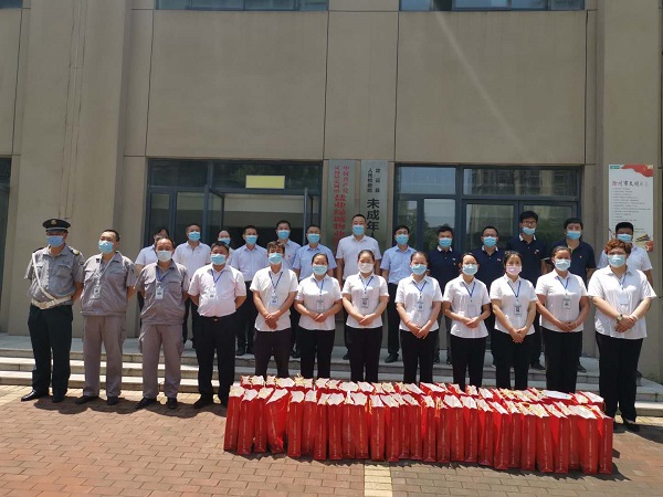 為慶祝中國共產黨成立99周年,6月30日上午,定遠項目黨支部組織黨員到徽鹽﹒曲陽世紀城小區,開展慰問小區物業一線員工為主題的迎“七一”黨日活動,并送去了口罩、消毒液、洗護用品等防疫消毒物資。