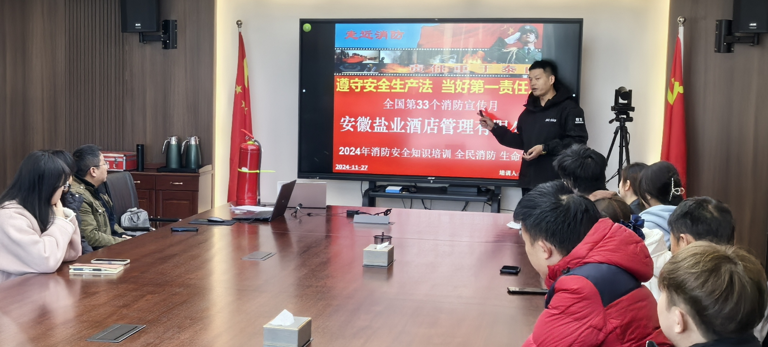 活動中,酒店公司邀請省消防協會專業教官講解火災預防、火情處置、火場逃生等事項,現場操作消防器材進行救火流程示范,并觀看2024安全警示片《危險降臨》。重點提升了緊急情況下的人員疏散逃生、初期火災及現場的應急處置能力,防止火災事故擴大,保障人員人身安全和財產免受重大損失。