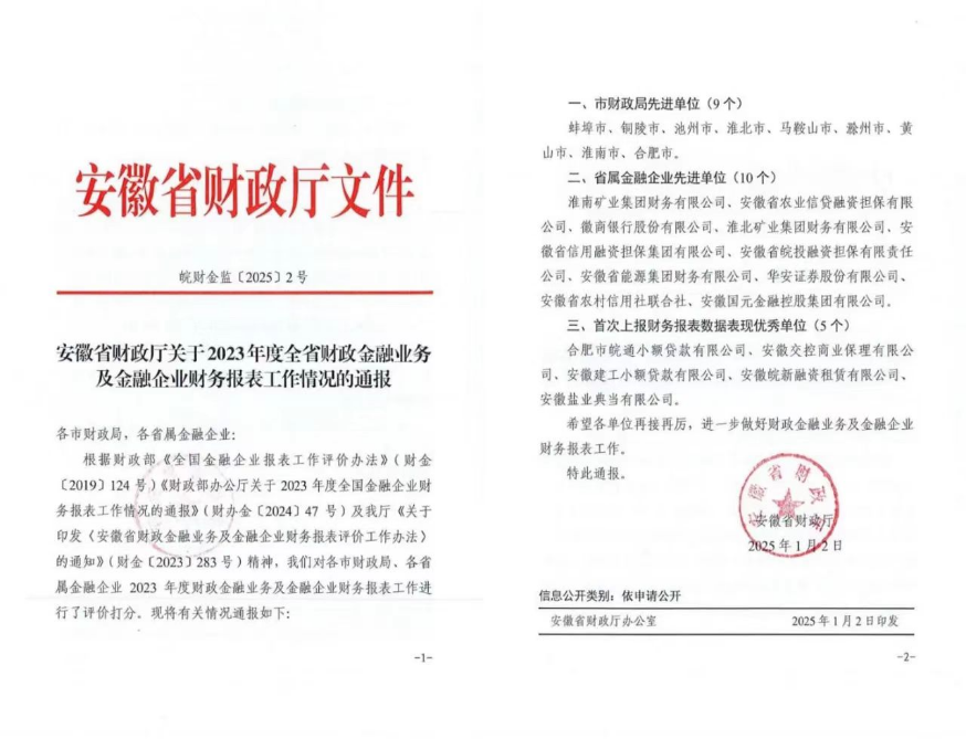 近日,安徽省財政廳依據《全國金融企業報表工作評價辦法》等相關文件精神,對各市財政局和省屬金融企業2023年度財政金融業務及金融企業財務報表工作進行了評價。徽鹽典當公司榮獲“首次上報財務報表數據表現優秀單位”榮譽稱號。